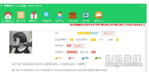 4、每天登陆赠送500积分,挂机每个小时赠送10积分,把助手发给别人每一个人增加500积分 并成为你的永久下线(你可获得他的充值奖励和挂机奖励)