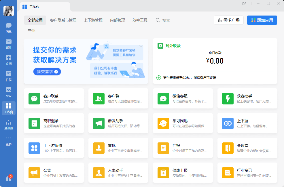 提供完备的支付能力,企业可以在企业微信内给员工发红包,给员工付款或向员工收款。